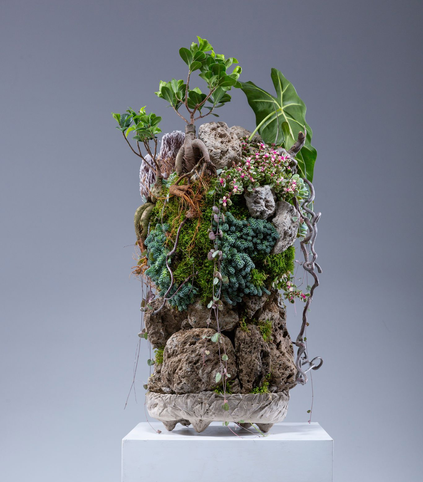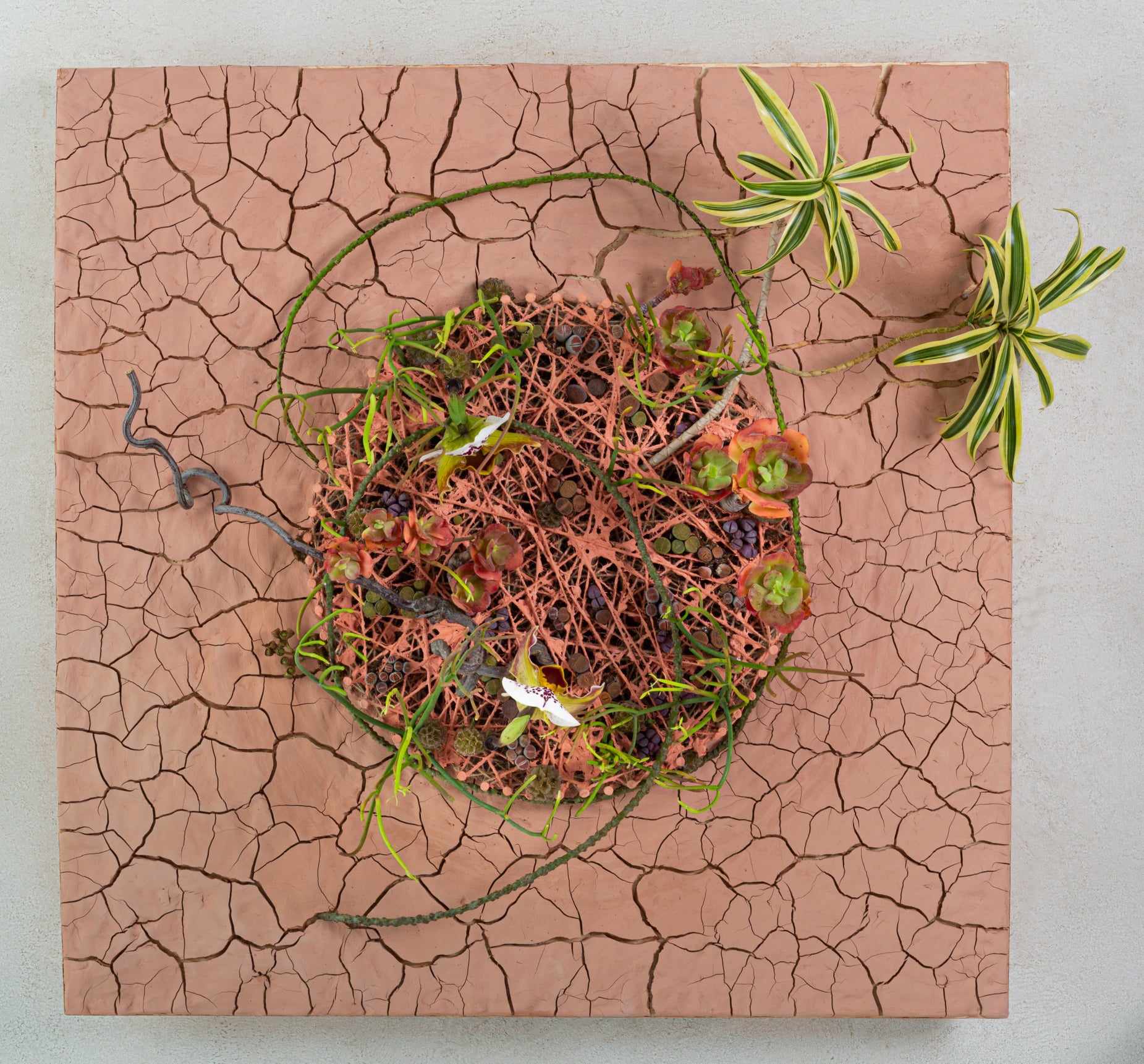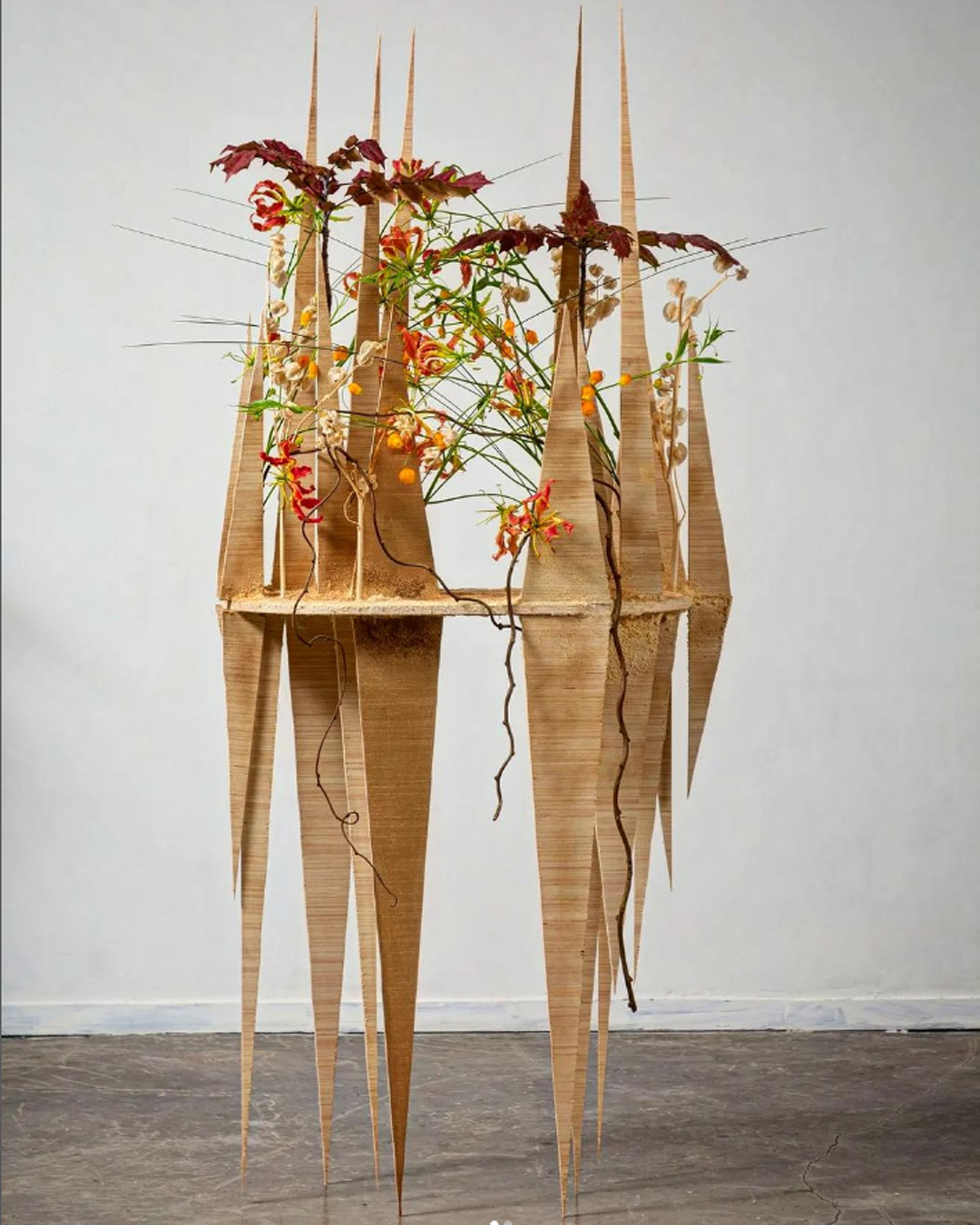 Het gebruik van botanische én niet-botanische materialen voor visueel en tactiel aantrekkelijke ontwerpen.